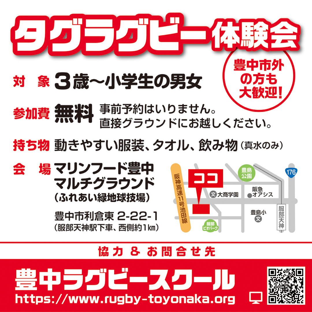 【4月19日】タグラグビー体験会を開催します 2026 3/27 お知らせ タグラグビー タグラグビー体験会 ミニラグビー ラグビースクール 子ども教室 2026-03-27 TRS 開催日:2026年4月19日(日) 時 間:9時30分~11時00分 場 所:マリンフード豊中マルチグラウンド ⇒ MAP 対 象:3歳~小学6年生の男女※豊中市内・市外在住は問いません 《参加方法》・参加は無料です・事前申し込み不要(直接グラウンドへおこしください) お知らせ タグラグビー タグラグビー体験会 ミニラグビー ラグビースクール 子ども教室 よかったらシェアしてね! URLをコピーしました! URLをコピーしました! 2年生 3月22日 活動ほうこく この記事を書いた人 TRS