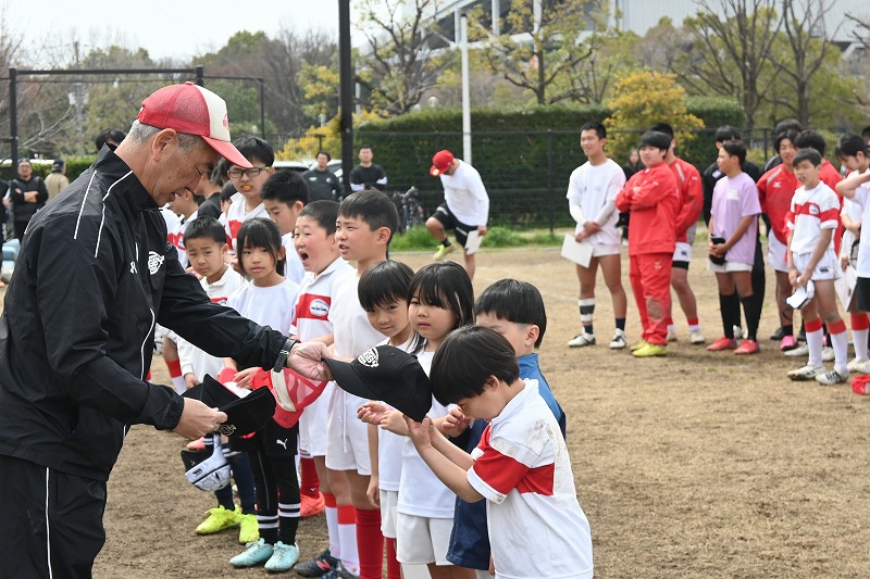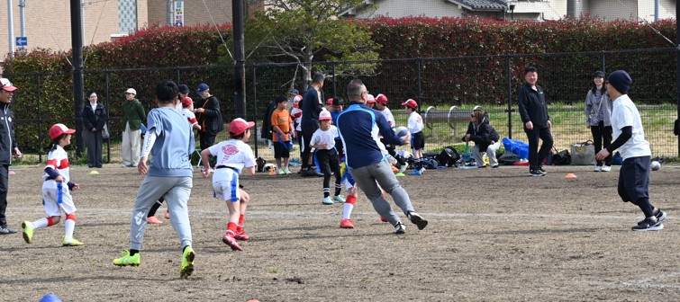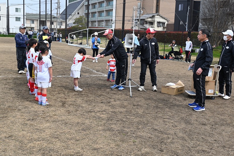 最終の小6の親子ゲーム。子どもたちのスピードと体力、スキルが上回り、親御さんに成長の証を存分に知らしめました。修了証交付後、練習に参加した精勤賞の授与があり、記念のキャップが手渡されました。グランド周辺の桜は開花が始まりました。